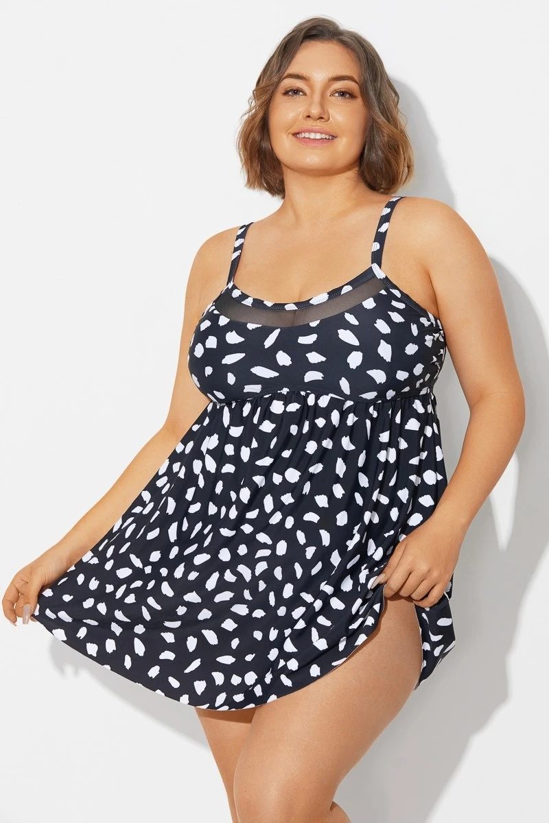 White Polka Dots Print Mesh Panel Swimdress -Meetcurve Shop b desd120001 3